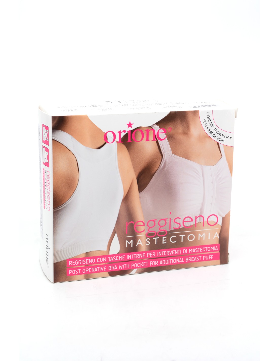 ORIONE REGGISENO POST-OPERATORIO 9651 PER MASTECTOMIA COLORE BIANCO. Reggiseno raccomandato nel post-intervento di mastectomia. Dotato di tasche interne nelle coppe, che possono contenere a seconda delle esigenze, una o due protesi di riempimento provvisorie.
