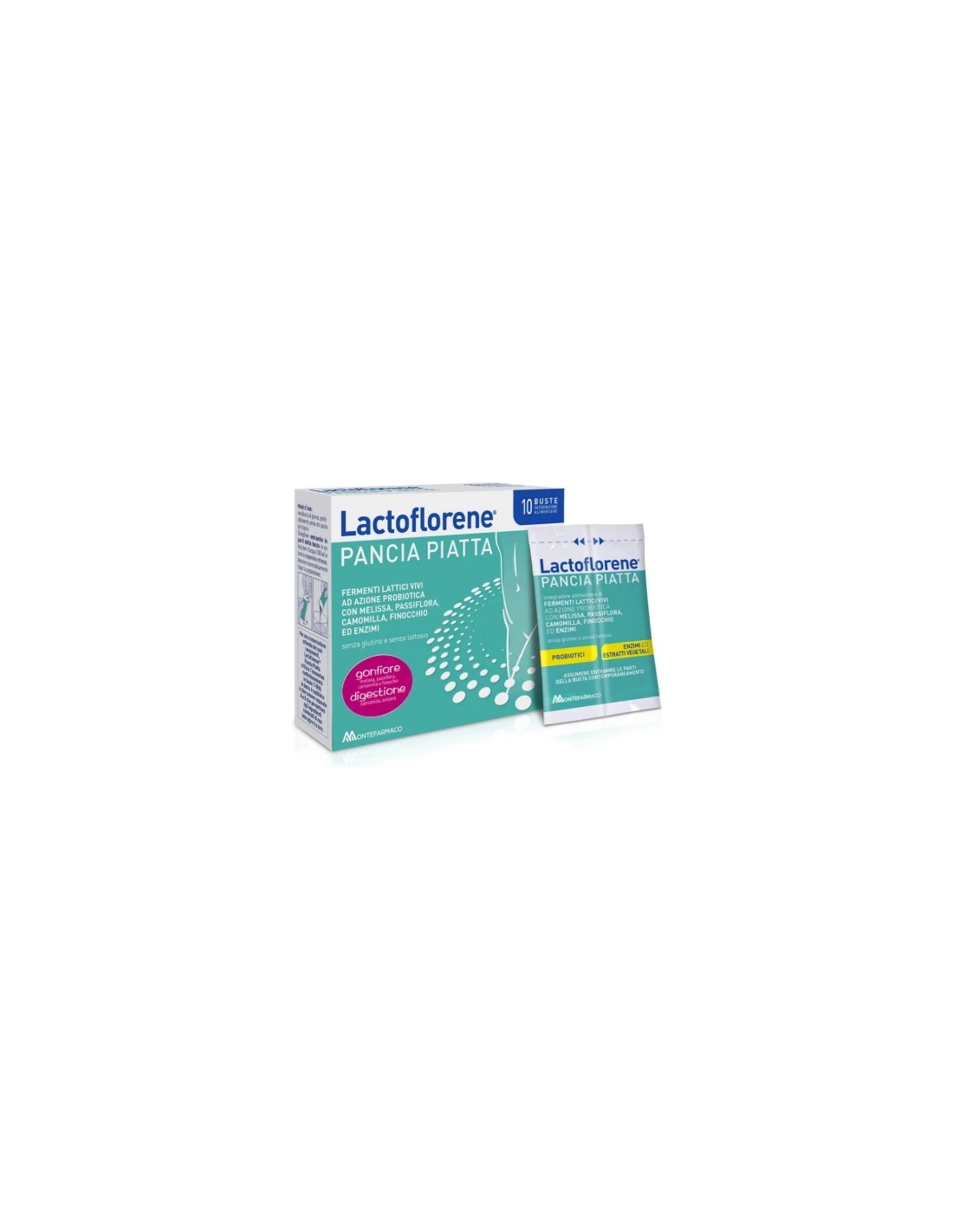LACTOFLORENE PANCIA PIATTA INTEGRATORE - 10 BUSTINE. Lactoflorene Pancia Piatta è un integratore alimentare a base di fermenti lattici vivi ad azione probiotica arricchito con enzimi ed estratti vegetali. I fermenti lattici favoriscono l’equilibrio della flora batterica intestinale a volte compromessa da disordini alimentari.