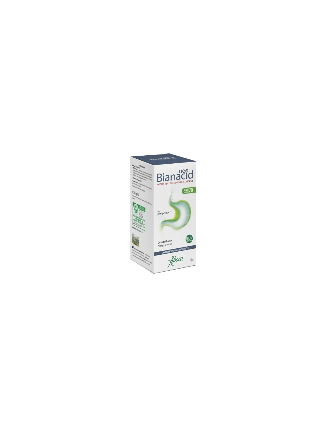 NeoBianacid forma sulla mucosa un film ad effetto barriera, che la protegge dal contatto con i succhi gastrici e le sostanze irritanti. NeoBianacid contiene Poliprotect, un complesso molecolare frutto della ricerca Aboca che, grazie alle sue proprietà muco?adesive, riproduce l'attività protettiva del muco fisiologico. Poliprotect agisce grazie alla sinergia tra la componente polisaccaridica (peso molecolare >20.000 dalton), dotata di alta affinità per la mucosa, e la componente minerale (Limestone e Nahcolite). Completano l'azione di Poliprotect le proprietà antiossidanti della componente flavonoidica che contrasta l'irritazione dovuta ai radicali liberi. NeoBianacid è indicato per il trattamento delle problematiche connesse all'acidità, quali bruciore, dolore, reflusso gastroesofageo e gastrite. È indicato anche nel trattamento dei sintomi associati a dispepsia (difficoltà di digestione), quali bruciore, pesantezza e meteorismo. NeoBianacid può essere utile in prevenzione, nelle situazioni che possono indurre irritazioni della mucosa (assunzione di farmaci antinfiammatori/antidolorifici non steroidei, periodi di stress psico-fisico, cambi di stagione, alimentazione e stili di vita scorretti). Il prodotto è adatto anche all'uso in gravidanza, durante l'allattamento e nei bambini sopra i 6 anni.