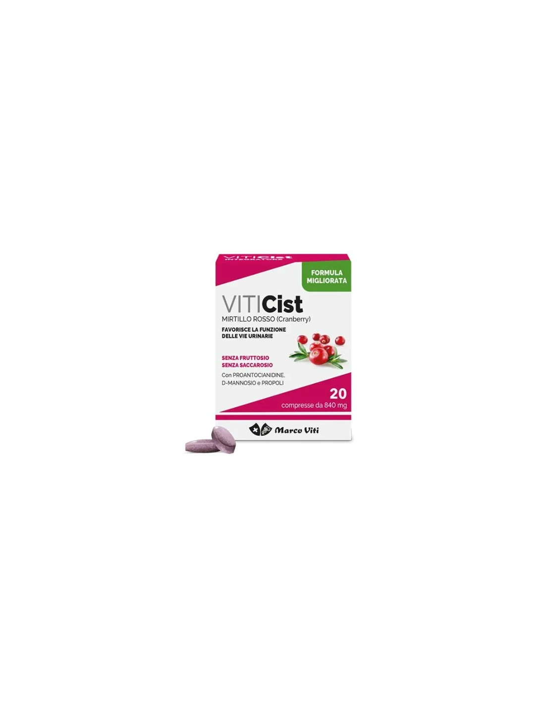 VITICIST INTEGRATORE PER VIE URINARIE AL MIRTILLO 20 COMPRESSE RIVESTITE. Viticist è un integratore alimentare di mirtillo rosso. In sinergia con PAC e D-Mannosio, è utile per favorire la funzione fisiologica delle vie urinarie.