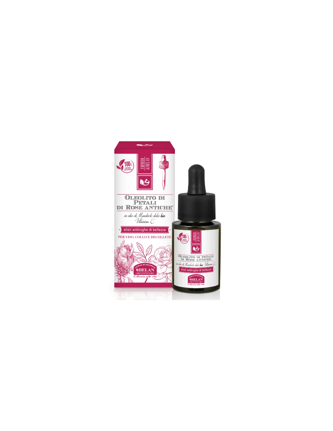 HELAN OLEOLITO PETALI ROSE 15ML. Puro oleolito di petali di Rose antiche* titolato in flavonoidi, polifenoli e antociani, macerati in olio di Mandorle dolci bio di prima spremitura della varietà di Toritto “cultivar Filippo Cea”, una eccellenza italiana sinonimo di qualità tra le più resistenti, rustiche e longeve.