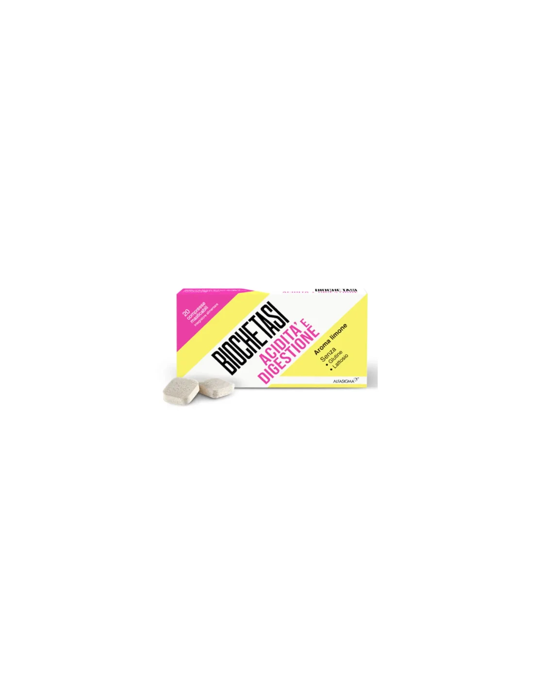 BIOCHETASI ACIDITA' E DIGESTIONE - 20 COMPRESSE. E' un integratore alimentare ben tollerato da tutta la famiglia, adulti, bambini dai 6 anni in su e donne in gravidanza e durante l’allattamento. È privo di glutine e lattosio.