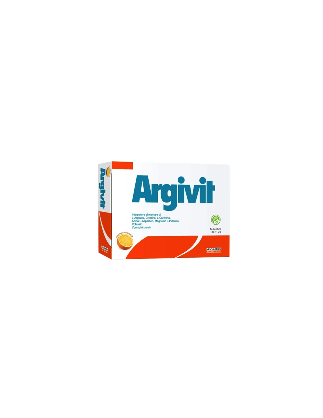 ARGIVIT INTEGRATORE ALIMENTARE - 14 BUSTINE GUSTO ARANCIA. Argivit è un integratore alimentare a base di L-Arginina, Creatina, L-Carnitina, Acido L-Aspartico, Magnesio L-Pidolato e Potassio citrato con Vitamine e Sali minerali. Con edulcorante. È indicato per tutti i casi di ridotto apporto dei suoi componenti con la dieta o di aumentato fabbisogno degli stessi. Il Magnesio contenuto in Argivit contribuisce all’equilibrio elettrolitico e alla riduzione di stanchezza e affaticamento, mentre il Potassio contribuisce alla normale funzione muscolare. Con succo d’arancia. Senza glutine.