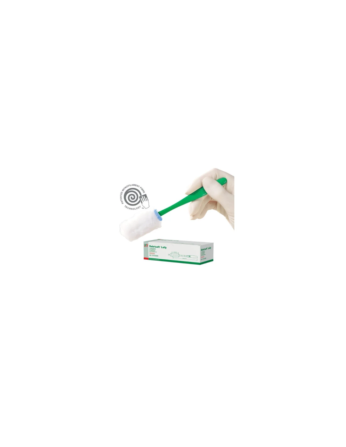 Composizione del prodotto: La testa di Debrisoft® Lolly è realizzata in fibre monofilamento di poliestere con un filo di contrasto radiopaco blu in polipropilene. L'interno è rivestito con poliacrilato per una migliore efficacia nel debridment. L'impugnatura in polipropilene garantisce un utilizzo sicuro e confortevole.