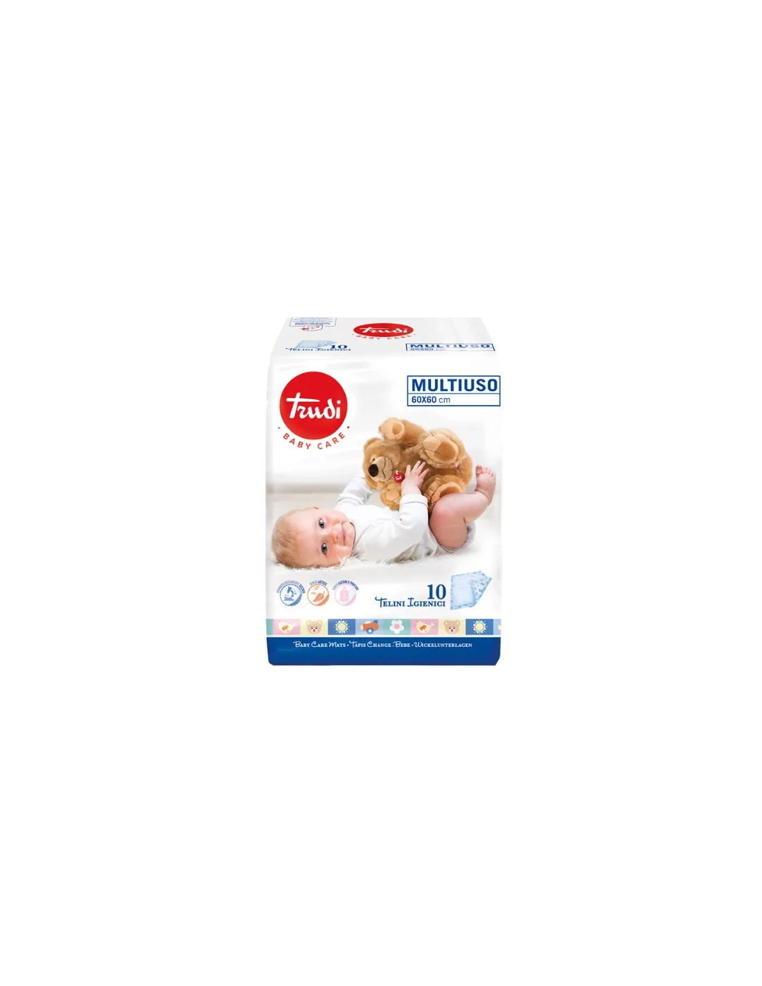 TRUDI BABY CARE - TELINI IGIENICI MULTIUSO PER BIMBI 10 PEZZI FORMATO 60X60. Adatto per proteggere i bimbi dalle varie superfici di appoggio.